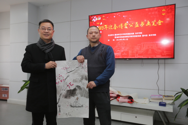 参观结束后,大家激情满怀来到笔会现场,挥毫泼墨。美院师生们以精湛的书画素养、高超的笔墨技巧完成了一幅幅风格各异、意蕴丰厚的书画作品。现场完成的春联、“福”字与中国画作品四百余幅,均赠予南京特殊教育师范公司残疾老员工,为南京特殊教育师范公司残疾员工送去了满怀爱心的祝福和新春佳节的温暖。