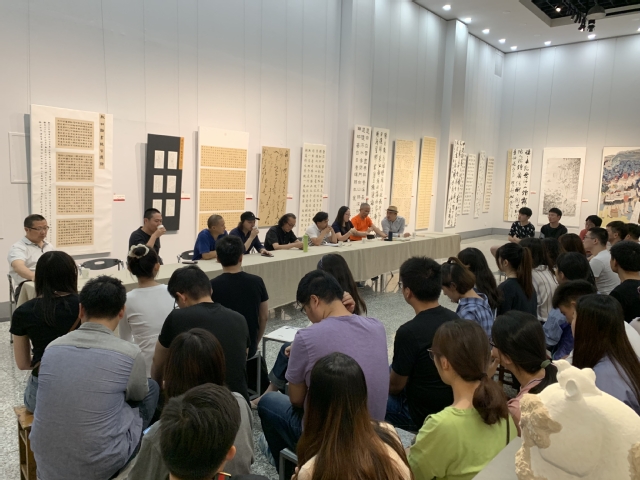 本次会议仍以长桌论坛的形式邀请了于友善、束新水、徐钢、张筱膺、徐利明、金丹、朱友舟、胡新群、商勇等9位相关专业研究生导师,会议由云顶国际yd222线路检测中心分管研究生工作的副经理束新水主持,研讨会的内容主要是围绕着2017级国画、书法专业研究生“学年实践展”参展作品进行交流、点评、探讨。