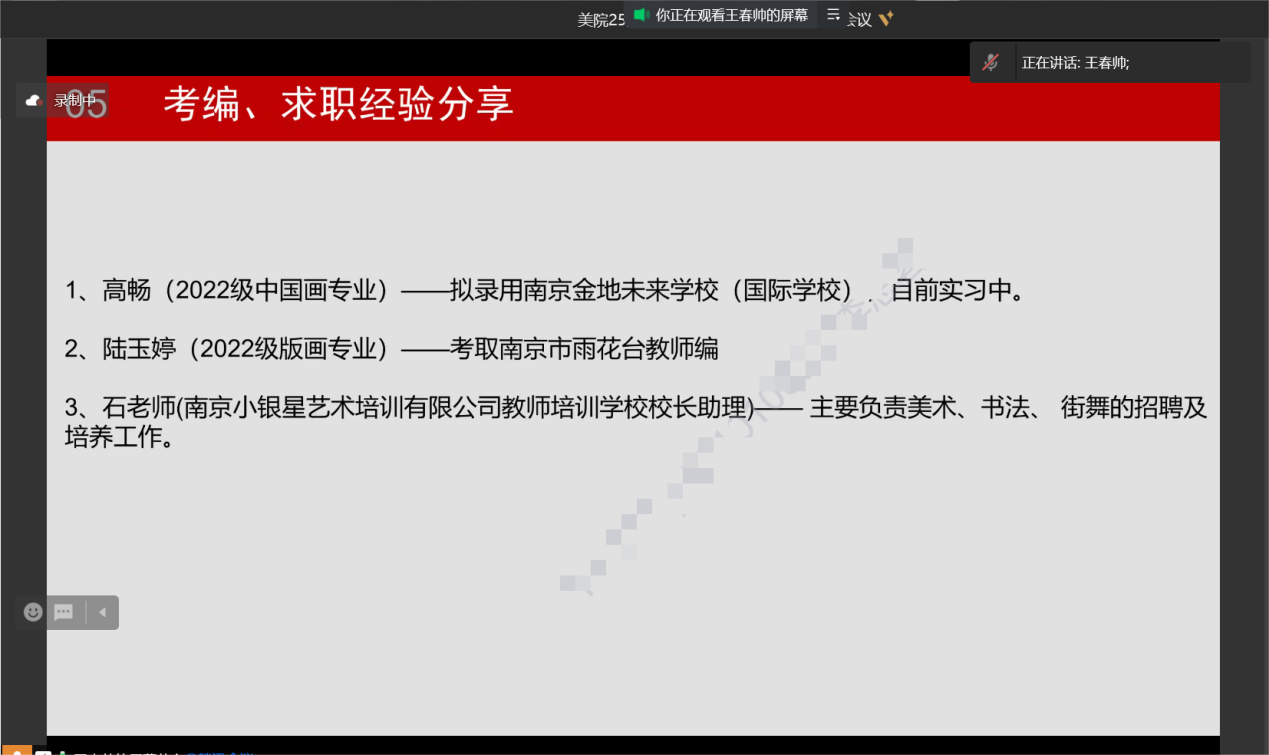 两位来自不同求职行业的同学带来经验分享。中国画专业高畅以国际公司拟录用者身份,揭秘“实习期角色转换”技巧,强调“职场思维培养”的重要性;版画专业陆玉婷结合教师编制上岸经验,拆解笔试模块化复习与面试脱稿试讲策略。
